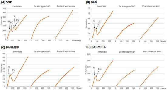 Representative graphs of real-time changes of DFF rate (%) of all experimental groups throughout the procedures, which consisted of the following three different timepoints: (1) before and after the application of desensitizer; (2) after the 2-week storage in SBF; (3) after ultrasonication. The DFF rate at each timepoint was measured for 5 min. The DFF rates (nL/s) are shown below the bar graphs, and the changes of DFF rate (%) are indicated with blue letters. Abbreviations: A, application of experimental desensitizer; LC, light-curing; SBF, simulated body fluid; SNP, Seal & Protect desensitizer; BAG, bioactive glass containing desensitizer; BAGMDP, bioactive glass and 10-Methacryloyloxydecyl dihydrogen phosphate containing desensitizer; BAGMETA, bioactive glass and 4-Methacryloxyethyltrimellitate anhydride.