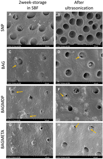 Representative SEM images of dentin surfaces: (A,B) SNP, (C,D) BAG, (E,F) BAGMDP, and (G,H) BAGMETA groups. SNP group (A,B). Left column images show the dentin surface after 2-week storage period in SBF, and right column images show the dentin surface after application of ultrasonication. The images present that the BAG-containing groups occluded exposed dentin surfaces with precipitates (arrows) and those occlusions were retained after the ultrasonication.