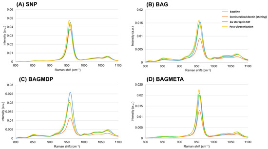 Figure 6 shows the Raman spectra for all the experimental groups. The most prominent peak for sound dentin in the range of 800 to 1100 cm−1 was found at 959 cm−1, which corresponds to the HAp phase of the dentin [29]. After demineralization, all groups showed a decrease in the peak at 959 cm−1. For the specimens after two weeks of storage in SBF, the intensity of the HAp peak increased by 60%, 75%, and 62% in the BAG, BAGMDP, and BAGMETA groups, respectively, compared with that after demineralization, whereas it increased by approximately 13% in the control group. After ultrasonication, the HAp peak was maintained or increased slightly in all groups.