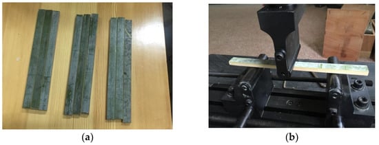 According to the specification [36], the Moso bamboo was processed along the grain into three types of bamboo reinforcements with a length of 220 mm and a width of 20 mm, and their thicknesses were 8, 10, and 12 mm, respectively. Three specimens were made for each type of bamboo reinforcements, totaling nine specimens, as shown in Figure 3a. The test instrument used was a CMT5105 universal testing machine, which was consistent with the tensile strength test. As shown in Figure 3b, the three-point loading method was used in this test, and the loading rate was set to 1 mm/min.