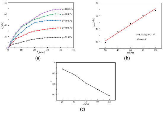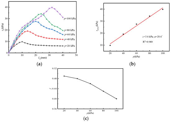From Figure 4a, it is found that under different vertical loads, the τp-Lp curve enters a descending stage after the shear stresses reach their peak value. Apparently, the pull-out curve exhibits a significant strain-softening feature. As observed, the maximum shear stresses are 9.80, 19.13, 27.53, 34.20, and 39.80 kPa when the vertical loads are 20, 40, 60, 80, and 100 kPa, respectively. Obviously, the magnitude of the vertical load not only affects the peak value of shear stress but also affects the displacement when the peak value occurs. During the pull-out test, the shear stress of the reinforced soil interface gradually changes synergistically with increased pull-out displacement, based on the mechanism analysis. Ultimately, the increased vertical load applied enhances the interfacial confinement of the reinforced soil. A linear fit was performed to the τpmax-p relationship shown in Figure 4b. It can be obtained that the interfacial cohesion (c) and the friction angle (φ) are 3.6 kPa and 20.6°, respectively, and the correlation coefficient (R2) of the linear fit is 0.989.