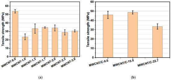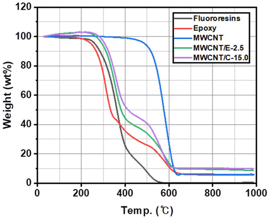 As shown in Figure 1, the hardened polymer resins showed similar trends in thermal decomposition. The epoxy had thermal decomposition temperatures of 304, 378, and 590 °C, and the fluororesin had thermal decomposition temperatures of 342, 372, and 521 °C. The MWCNT/C-15.0 sample had lower epoxy content and higher MWCNT content than the MWCNT/E-2.5 sample, which resulted in an MWCNT content of approximately 10.0 wt% at the MWCNT pyrolysis temperature of 584 °C.