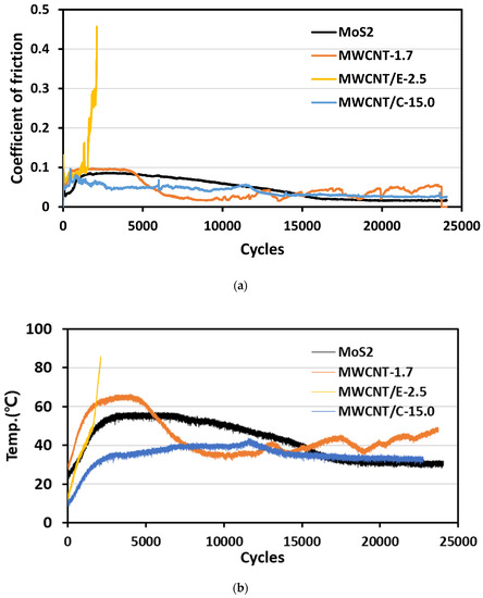 MoS2 and graphite are commonly added to solid lubricants to improve performance. Graphite consists of weakly bound C planes that slide over each other, resulting in a low CoF [1,2]. MoS2 is formed of hexagonal planes of S atoms either side of a hexagonal plane of Mo atoms, and the S atoms are bonded to the top and bottom of the Mo surface. MoS2 is soft because it contains a transition metal. However, it has high hardness; thus, it maintains a low CoF [3,4,5]. Therefore, solid lubricants with MoS2 as an additive can have excellent lubricating properties. However, when MoS2 is used as an additive, the initial CoF, under an actual load of ≥20 tonnes, is higher than that when multiwalled carbon nanotubes (MWCNTs) are used. This is considered to be because the π–π interaction energy in MWCNTs (−0.5 to −2.0 kcal/mol) is significantly lower than the S–S interaction energy in MoS2 (2.4 to 4.3 kcal/mol) [6]. Moreover, such differences will become more apparent as the external load increases.