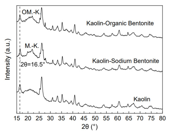 XRD analysis can reflect the changes of material composition and spatial structure. The XRD patterns of kaolin, kaolin-sodium bentonite, and kaolin-organic bentonite are shown in Figure 2. As shown in the figure, the layer spacing of the three adsorbents is 0.60 nm, and the value of 2θ, corresponding to the d001 characteristic peak, is about 16.5°. From the figure, it can be seen that the characteristic peak positions of the three adsorbents are basically the same; this is because there is no obvious change in kaolinite layer spacing after the introduction of sodium bentonite and organic bentonite. However, when 2θ is 22°, the characteristic peak values of kaolin-sodium bentonite and kaolin-organic bentonite adsorbents increase sharply, as shown at the M.-K. position in the figure. This is because the addition of sodium bentonite makes the sodium bentonite bond with kaolin to produce a new kaolin bentonite polymer; it is a new characteristic peak formed by this polymer. The characteristic peak value at the OM.-K. position is reduced because the introduction of the modifier reduces the cementation degree between kaolin and sodium bentonite, and it destroys the polymer structure. This phenomenon can also be reflected in Figure 1. The position and increased amplitude of other peaks are basically the same as that of kaolin. XRD results show that the introduction of sodium bentonite increases the montmorillonite content, internal space, adsorption points, and thus, the adsorption capacity. Montmorillonite has strong adsorption advantages due to its large natural specific surface area, and the introduction of montmorillonite enhances the adsorbent’s adsorption capacity.