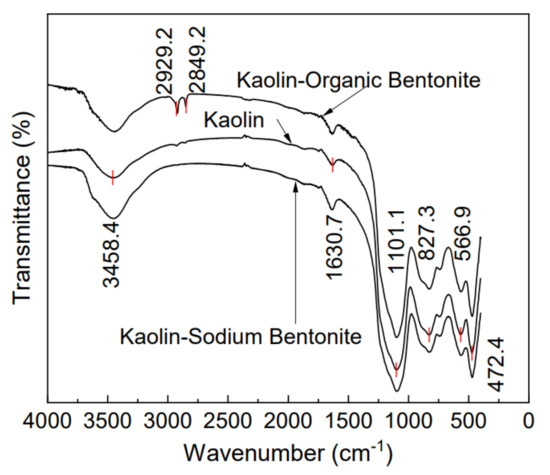 FTIR spectra of kaolin, kaolin-sodium bentonite, and kaolin-organic bentonite are shown in Figure 3. It can be seen, from the figure, that the FTIR spectra of the three adsorbents have roughly the same peak shape, indicating that the addition of a small amount of sodium bentonite or organic bentonite does not significantly change the basic skeleton of kaolin. The characteristic peak 3458 cm−1 is caused by the stretching vibration of H-O-H, and the characteristic peak 1630 cm−1 is caused by the left and right bending vibration of H-O-H [28]. The characteristic peaks 2929 cm−1 and 2849 cm−1 are caused by the introduction of -CH3 in the CTMAB modifier, and the track between the characteristic peak 471–1101 cm−1 is related to the stretching and bending vibration of Si-O-Si and Si-O-Al [23]. On the whole, the transmittance of kaolin is the lowest, and the transmittance is improved after the introduction of sodium bentonite and organic bentonite.