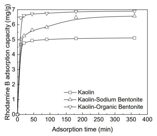 Under the conditions of pH 9.1 and temperature 25 °C, the adsorption process of the three adsorbents for rhodamine B solution, with an initial concentration of 200 mg/L, is chosen as the representative result (Figure 4). It is obvious that adsorption time has a significant effect on the removal quantity of rhodamine B. In the first 10 min, the adsorption amount for rhodamine B by each adsorbent increases rapidly with the increase in adsorption time, and then, with the continuous increase in adsorption time, the increase rate of rhodamine B adsorption amount decreases, and the adsorption amount tends to be stable after a certain time. This is because, in the initial stage of adsorption, there are many active adsorption sites, which can have enough space to contain organic pollutants. With the advance of time, their holding capacity gradually reaches the peak, and the change of adsorption amount turns gentle [7]. The time for kaolin to reach adsorption equilibrium is about 90 min, and the maximum adsorption quantity for rhodamine B is 5.10 mg/g. The equilibrium time of kaolin sodium bentonite is 180 min, and the maximum adsorption capacity of Rhodamine B is 6.57 mg/g. The time for kaolin-organic bentonite to reach the adsorption equilibrium is about 180 min, and the maximum adsorption quantity for rhodamine B is 6.90 mg/g. After adding bentonite to kaolin, the adsorption rate and maximum adsorption quantity for rhodamine B increase. Kaolin-organic bentonite has the fastest adsorption rate and the highest adsorption amount for rhodamine B. The reason is twofold: (1) the scaly lamellar structure of bentonite provides a channel for the adsorption and migration of rhodamine B; (2) the rich adsorption sites on the surface of organic bentonite improve the adsorption efficiency for rhodamine B [23,29].