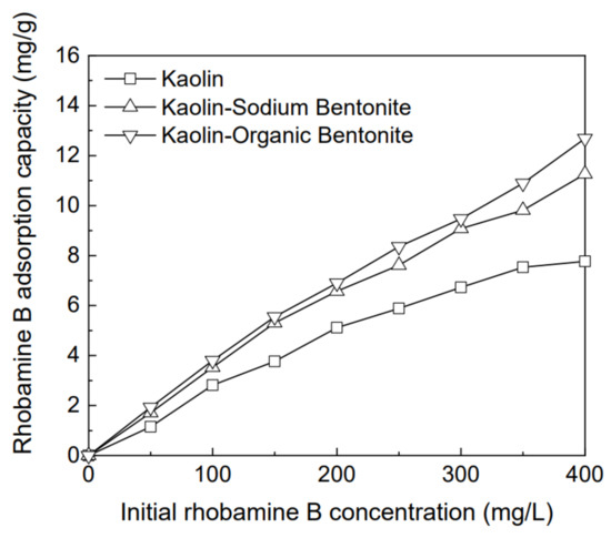 Under the conditions of pH 9.1, temperature 25 °C, and adsorption time 360 min, the variation of the maximum adsorption quantity for rhodamine B, by different adsorbents with the initial concentration of the rhodamine B solution, is shown in Figure 5, where the initial concentration varies from 50 to 400 mg/L. It can be seen, from the figure, that the maximum adsorption quantity of kaolin for rhodamine B gradually stabilizes with the increase in the initial concentration of rhodamine B solution, while those of kaolin-sodium bentonite and kaolin-organic bentonite, for rhodamine B, always increase linearly with the increase in the initial concentration of rhodamine B solution. This implies that the adsorption amount for rhodamine B by the three adsorbents is positively correlated with the initial concentration of rhodamine B solution, and the adsorption amount of kaolin-sodium bentonite and kaolin-organic bentonite for rhodamine B still has the potential to increase. This may be related to the contact between the molecules of rhodamine B and the adsorption sites of the adsorbent. With the increase in the initial concentration of the rhodamine B solution, the contact between the molecules of rhodamine B and the available adsorption sites is promoted, and a higher number of rhodamine B molecules are adsorbed by the adsorbent [6,22]. When the initial concentration of rhodamine B was 400 mg/L, the adsorption capacities of kaolin, kaolin-sodium bentonite, and kaolin-organic bentonite were 7.76 mg/g (the corresponding rhodamine B removal rate was 48%), 11.26 mg/g (the corresponding rhodamine B removal rate was 70%), and 12.68 mg/g (the corresponding rhodamine B removal rate was 79%), respectively. Therefore, adding bentonite to kaolin can effectively improve its adsorption capacity for rhodamine B.