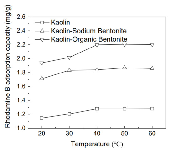 Under the conditions of pH 9.1 and adsorption time 360 min, the adsorption capacity of the three adsorbents for 50 mg/L rhodamine B with temperature is shown in Figure 6, where the temperature range is 20–60 °C. The adsorption amount for rhodamine B by kaolin, kaolin-sodium bentonite, and kaolin-organic bentonite basically increases with the increase in temperature, but the increase rate of adsorption amount of the three adsorbents with temperature decreases at 40 °C, 30 °C, and 40 °C, respectively. With the further increase in temperature, the adsorption amount no longer increases significantly. The reason for this adsorption trend with the temperature variation may be that the increase in temperature promotes the diffusion rate of rhodamine B molecules in the adsorbent [30]. When the temperature was 60 °C, the three adsorbents reached the maximum adsorption quantity, and the corresponding adsorption capacities of rhodamine B were 1.28 mg/g, 1.85 mg/g, and 1.98 mg/g, respectively.
