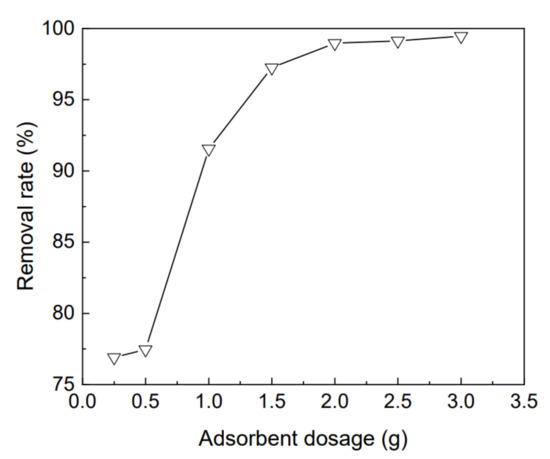 Under the conditions of pH 9.1, adsorption time of 360 min, and temperature of 25 °C, the removal rate for 50 mg/L rhodamine B, with different kaolin-organic bentonite dosages, is shown in Figure 7, where the dosage of kaolin-organic bentonite varies from 0.25 g to 3 g. When this dosage gradually increases from 0.25 g to 2.0 g, the removal rate for rhodamine B increases from 76% to 98%, displaying significant improvement. This is mainly due to the increase in adsorbent dosage, which increases the total surface area of the adsorbent and provides more adsorption sites. When the dosage of kaolin-organic bentonite continues to increase from 2.0 g to 3.0 g, its adsorption capacity for rhodamine B does not increase significantly, which may be related to the limited concentration of rhodamine B and the formation of an agglomerate in clay minerals [6].