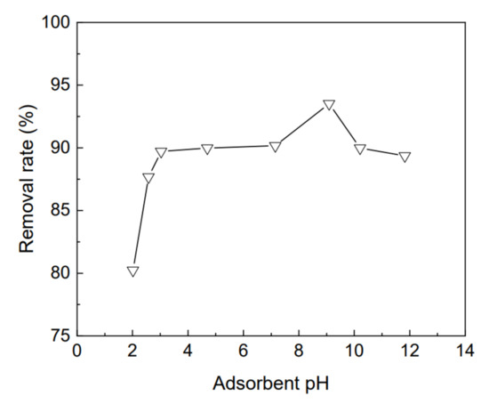 Under the conditions of adsorption time 360 min, temperature 25 °C, and adsorbent dosage 0.25 g, the variation of the removal rate of kaolin-organic bentonite, for 50 mg/L rhodamine B with pH value, is shown in Figure 8, where the pH value varies from 2.0 to 11.8. The results show that the adsorption for rhodamine B, by kaolin-organic bentonite, is closely related to pH [22,31]. When the pH value increases from 2.0 to 11.8, the adsorption capacity of kaolin-organic bentonite, for rhodamine B, first increases to the maximum value and then decreases. When the pH value was 2.0, the adsorption capacity was the lowest, and the removal rate was 80%. When the pH value was 9.1, the adsorption capacity reached the highest, and the removal rate for rhodamine B was 93%.