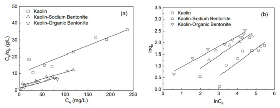 Langmuir (Figure 9a) and Freundlich (Figure 9b) models were used to fit the test results, and the corresponding constants were calculated according to the intercept and slope. The relevant parameters are shown in Table 2. It can be seen from Table 2 that, for kaolin and kaolin-sodium bentonite, the correlation coefficient (R2) of the Langmuir model is significantly higher than that of the Freundlich model, while for kaolin-organic bentonite, the correlation coefficient of the Langmuir model is lower than that of the Freundlich model. Therefore, the Langmuir model is more suitable to describe the adsorption of rhodamine B by kaolin and kaolin-sodium bentonite, while the Freundlich model is more preferable to describe the adsorption of rhodamine B by kaolin-organic bentonite.