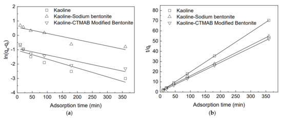 The fitting results of adsorption kinetics of rhodamine B by different adsorbents are shown in Figure 10, and the relevant parameters of fitting are shown in Table 3. It can be seen that some correlation coefficients of the pseudo-first order kinetic model are lower than 0.90 and always lower than those of the pseudo-second order kinetic model, while the correlation coefficient of the pseudo-second order kinetic model is always higher than 0.98. The correlation coefficient of the pseudo-second order kinetic model is closer to 1 than that of the pseudo-first order kinetic model, which indicates that the adsorption kinetic characteristics of rhodamine B, by kaolin, kaolin-sodium bentonite, and kaolin-organic bentonite, are suitable to be described by the pseudo-second order kinetic model. This model is based on the adsorption capacity of the solid phase and considers that the driving force of the adsorption is the difference between the solid phase concentration at any time and at equilibrium [22].