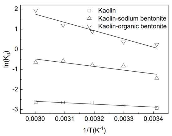 where Δ G ° is the standard adsorption free energy change (kJ/mol), Δ H ° is the standard adsorption enthalpy change (kJ/mol), Δ S ° is the standard adsorption entropy change (kJ/(mol K)), R is universal gas constant (8.324 kJ/mol), T is absolute temperature (K), and Kd is the equilibrium constant. The values of Δ H ° and Δ S ° were obtained from the slope and intercept of the plots of ln(Kd) against 1/T (Figure 11).