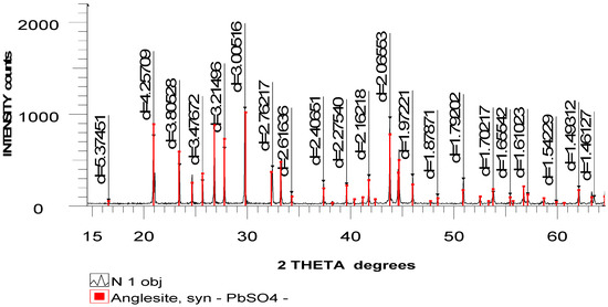 X-ray phase analysis demonstrated that the lead slurry is almost 100% lead sulfate, as shown in Figure 1. The analysis was carried out on an automatic diffractometer DRON-3 with CuKa-radiation and a β-filter. Conditions of diffractograms: U = 35 kV; I = 20 mA; firing = θ–2θ; detector = 2 deg/min.