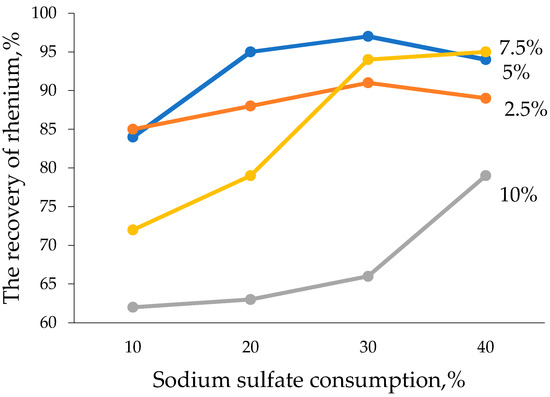 From the given solution, rhenium can be extracted by sorption–desorption methods on ions [23] or on a sorbent obtained from rice husk [24], precipitation with ammonium salts [25], and also by extraction–re-extraction. In our case, rhenium was extracted in the form of ammonium perrhenate corresponding to AP-00 grade by extraction and re-extraction. Recrystallized sodium sulfate contains up to 0.005% rhenium, which is returned to the lead slurry smelting process.