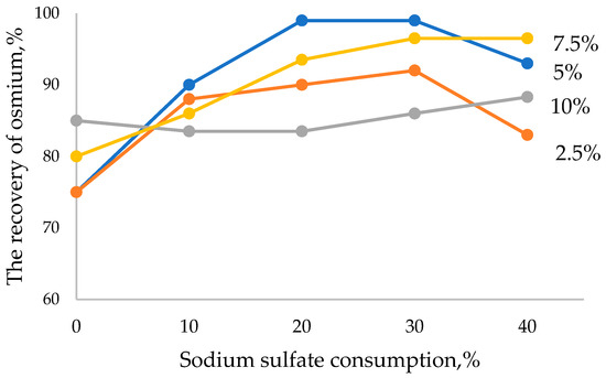 Effect of consumption of sodium sulfate and coke on the degree of extraction of osmium into the alloy.