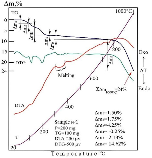 Thermogravimetric readings of lead sludge at 20–1000 °C with 40–85 °C change in sample mass: Δm1 = −1.50%, -H2O; at 85–155 °C; -Δm2= −1.75%, -H2O; at 155–240 °C—Δm3 = −4.25%, -CO2; -H2O; at 240–320 °C—Δm4 = +0.25% +O2; at 320–430 °C,—Δm5= −2.13%, -CO2; at 740–1000 °C—Δm6 = −14.62%—SO2, sublimation; at 20–1000 °C sample mass change in total Δm = −24.00%.