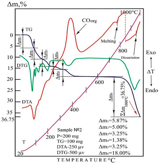 The obtained thermogravimetric readings of the system under the test, taking into account the mass loss beyond 1000 °C, are in good agreement with the set of stoichiometric data related to the components of the analyzed mixture.
