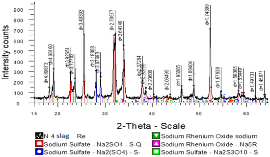 Sodium sulfate serves as a slag-forming element, where elements with high affinity to oxygen, such as rhenium and arsenic, are concentrated to form perrhenates and arsenates. The X-ray diffraction analysis of sodium sulfate slag at Figure 6 shows that sodium sulfate is present in two structural modifications, part of the sodium sulfate (41.4%) also undergoes structural changes during melting, and rhenium is present in two perrhenate forms, NaReO4 and Na5ReO6. Formation of perrhenates with anionic residue ReO4− proceeds in wide temperature intervals with metal oxides, but Na5ReO6 formation requires special conditions of synthesis at the interaction of sodium oxide Na2O and metallic rhenium [22].