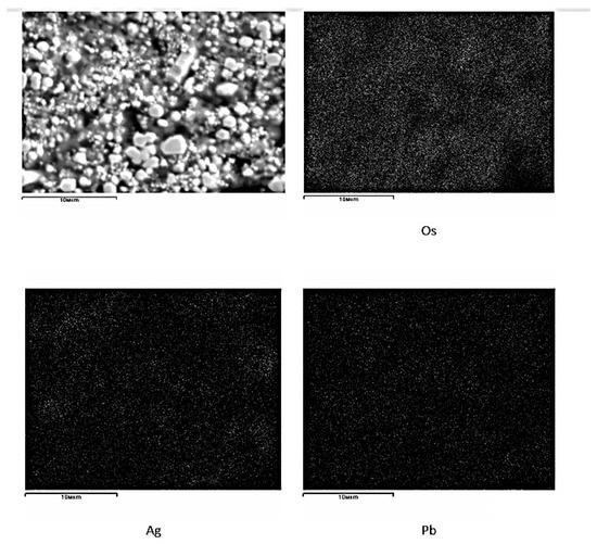 To study the forms of finding osmium, concentrated parts of crude lead were crushed and dissolved with nitric acid with a concentration of 8% at S:L=1:3 at 60 °C to transfer lead into the solution. Under these conditions, no transition of osmium to solution or to the gas phase was observed. Two-fold dissolution yielded a concentrate containing 65% osmium and 15% lead. Further reduction of the concentrate mass with a dissolution of lead leads to partial oxidation of osmium; therefore, studies were conducted with this concentrate. Microprobe analysis of the concentrate in Table 6, Figure 7 shows that osmium is present in crude lead in the form of a metallic state, which indicates the completeness of its compound recovery.