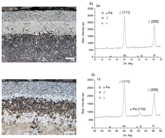 The structure of the near-surface zone of the iron nitride layer after annealing (sample 13) is clearly different from the structure of sample 3A. The thickness of the porous zone increased from 20 to 26 μm, and also increased in porosity (Figure 1c). A significant part of the non-porous zone (the black area directly below the porous zone) was decomposed. The intensity of the lines, characteristic of the planes γ’ {111} and γ’ {200} decreased. On the diffractogram, there is a line characteristic of the α-Fe substrate, and its appearance may be associated with the disappearance of part of the non-porous zone of iron nitrides (Figure 1d). The disappearance of this zone also explains the large loss in mass of the samples after annealing, compared to other samples (see Figure 2).
