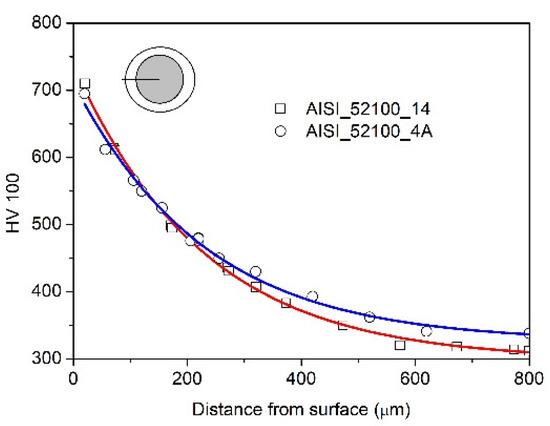 Distribution of the hardness (cross-section through the ball) in the nitrided layer (4A) and nitrided and annealed steel (14).