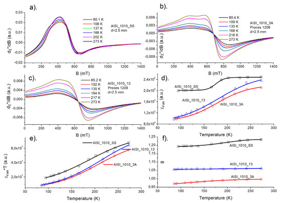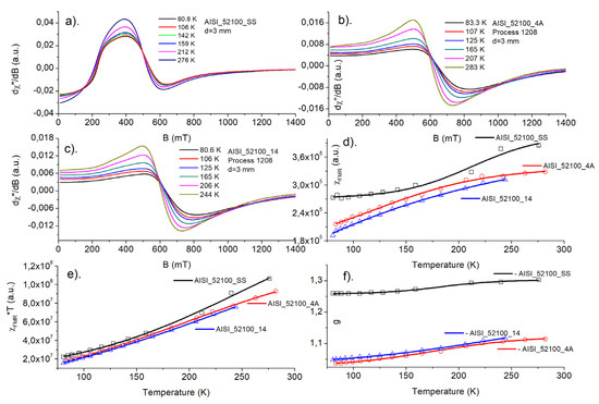 In the Figure 5a–c and Figure 6a–c, temperature dependence of FMR spectra is shown for starting sample (SS), nitrided (3A for AISI_1010 and 4A for AISI_52100 steels), and nitrided and annealed steel (13 for AISI_1010 and 14 for AISI_52100 steels), respectively. As one can see, a shape of FMR signal changes significantly, when successive process is applied.
