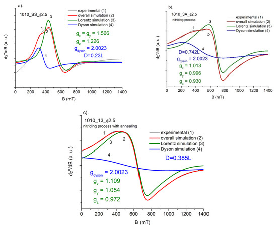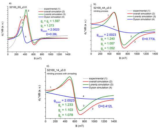 Simulation of the FMR spectra of AISI 52100: SS, 4A, and 14 balls: (a). Starting sample (SS), (b) nitrided (4A) and (c) nitrided and annealed (14). Ball diameter Φ = 3 mm. gi—simulated parameters of g-matrix. D—the ratio of the signal coming from the Dyson line to the signal coming from the Lorentz line.