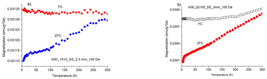 Figure 10a,b shows magnetization measurements of starting samples for AISI_1010 and AISI_52100 steels. As can be seen the samples characterize large magnetic anisotropy and unusual temperature dependence in a 3–300 K temperature range. The measurements were performed at FC and ZFC modes. For the investigated samples, we observed that the magnetization was slightly weaker, when the investigations were performed in a stronger magnetic field.