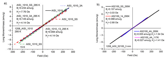 (a). Hysteresis loops for AISI_1010 samples, (b). Hysteresis loops for AISI_52100 samples. Hc and Br—coercive field and remnant parameter, respectively.