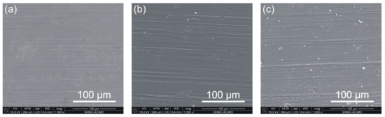 Several delaminations can be observed on the unmodified steel surface due to the rolling of the steel sheet and scratches resulting from grinding. The silicon carbonitride layer deposited on the steel samples without N+ ion modification (Figure 1b) and after N+ ion modification (Figure 1c) does not significantly reduce the visibility of these surface defects.