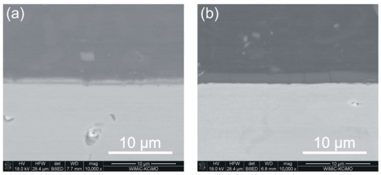 EDS results obtained from the surface of the tested samples confirm the approximate layer chemical compositions, determined as SiC1.4N0.8 in the case of the sample without N+ ion modification and SiC1.5N0.9 for the N+ ion modified material. In addition, combined SEM-EDS cross-section measurements revealed that layers are homogenous in terms of chemical composition. The below images (Figure 2a,b) demonstrate SEM cross-sections of steel samples from both series (with the SiCxNy:H layer and with the previously nitrided surface and the same layer applied). In the first case, the average layer thickness does not exceed 1.0 µm and is about 1.7 µm for the nitrided series.