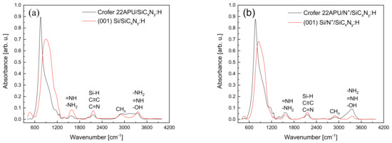 Figure 3a,b compiled the FT IR spectra of the layers obtained on the (001)Si and Crofer 22APU substrates without N+ ion modification and those subjected to the previous N+ ion modification process.