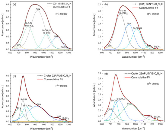 Deconvolution of FT IR spectra in the range of 600–1350 cm−1 for (a) SiCxNy:H layer on (001) Si, (b) N+ ion modification, and SiCxNy:H layer on (001) Si, (c) SiCxNy(H) layer on Crofer 22APU and (d) N+ ion modification and SiCxNy:H layer on Crofer 22APU.