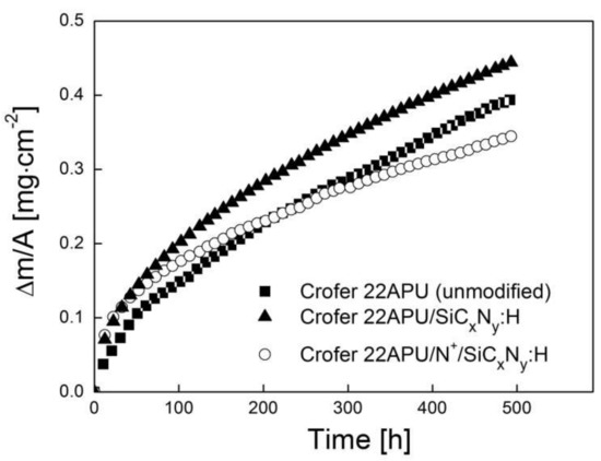 One of the most important requirements for exposing metallic interconnects to oxidizing SOFC atmospheres at 1073 K is good resistance against high-temperature corrosion. In order to compare the properties of the Crofer 22APU steel with the silicon carbonitride layer deposited using RF CVD without N+ ion modification (SiCxNy:H) and after prior N+ ion modification (N+/SiCxNy:H) and those of unmodified steel—all after oxidation in air at 1073 K—their oxidation kinetics were investigated over a period of 500 h using isothermal thermogravimetric analysis.
