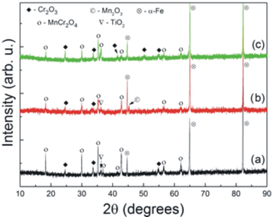 XRD studies (Figure 8) revealed that Cr2O3, MnCr2O4, and TiO2 phases formed during prolonged exposure of the unmodified steel to the corrosive conditions. In the case of the steel sample without N+ ion modification, Mn2O3 was detected along with the other previously mentioned phases, whereas only MnCr2O4 and Cr2O3 were determined on the N+ ion modified sample. In addition, there are high-intensity reflections that can be attributed to the α-Fe phase that constitutes the metallic substrate in every diffraction pattern presented in this figure.