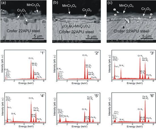 Figure 9 shows the polished cross-sections of corrosion products formed on each of the three types of samples after 500 h of oxidation in air at 1073 K, as well as EDS point analyses at the locations indicated using numbers 1–6 in Figure 9c.
