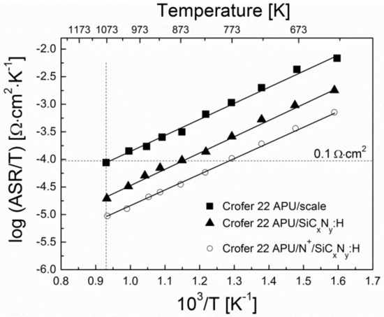 Table 7 lists the area-specific resistance (ASR) values of the studied Crofer 22APU/scale, Crofer 22APU/SiCxNy:H, and Crofer 22APU/N+/SiCxNy:H layered systems oxidized in air at 1073 K as well as the values of activation energy of electrical conduction (Ec) for the entire investigated temperature range, determined from the linear dependence ln(ASR) = f(1/T).
