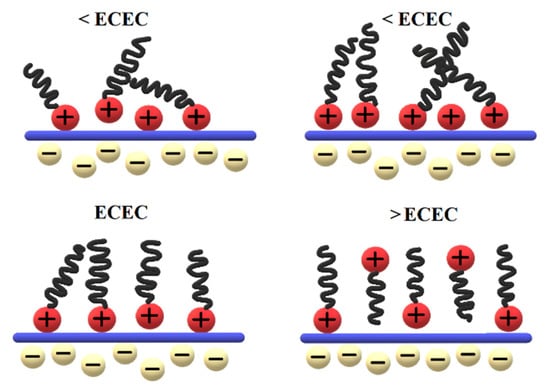 The cationic surfactant represented in this work by HDTMA is too large to penetrate the zeolite structure, therefore only surface interaction is observed []. If an amount of surfactant less than the external cation exchange capacity (ECEC) is introduced, organic cations adsorbed with positively charged heads on the mineral surface form a monomeric layer. As the surfactant is subsidized, a thickening of the structure is observed. The formation of the second, oppositely positioned layer is a result of the organic cations’ tendency to form micelles. When the ECEC value is exceeded, a second monolayer is attached to the first one on electrostatic interactions between hydrocarbon chains. The mechanism of sorption of cationic surfactants is presented in Figure 2. The second layer with hydrophobic properties is capable of adsorbing anions [,]. In fact, the first layer already shows some sorption properties toward anions, as incomplete charges can be formed and an excess of positive charges can be generated at some places on the zeolite surface. The adsorption capacity towards anions presented by the surfactant monolayer is explained by the heterogeneity of the charge density on the zeolite surface [,,,,].