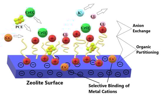 The organo-zeolite retains a low affinity for transition metal cations, which can bind to the mineral surface by ion exchange. Moreover, modification of the mineral with long-chain organic compounds leads to the formation of a zone responsible for the sorption of molecules of apolar alkylaromatic compounds. Because of its various sorption capacities, organic zeolite is a mineral with a wide range of applications []. The mechanism of anion sorption in organo-zeolite is shown in Figure 3.
