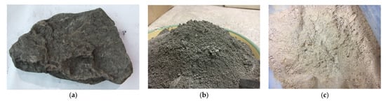 Coal shale used in the study: (a) in raw form; (b) after mechanical treatment—crushing and grinding; (c) after calcination.