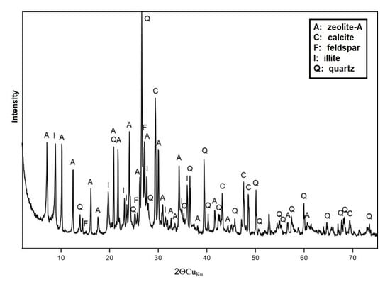 The diffractogram obtained shows very high peaks arising from phases such as quartz and calcite. However, the overall diffractometric analysis of the AS material is dominated by peaks originating from zeolite-A. Additionally, phases such as feldspar and ilite were included in the analysis of the AS material.