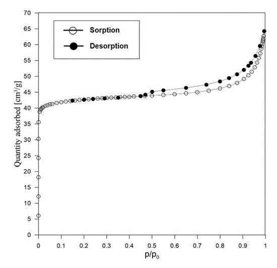 The isotherm presented represents a type I isotherm, characteristic of microporous materials. The results presented in Table 3 (based on [,]) show that the proportion of micropores in this sample is 68%. The proportion of mesopores is 20% and macropores 12%.