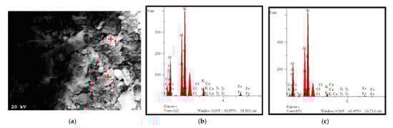 Particle morphology: (a) material after calcination (before synthesis and modification); (b) qualitative chemical analysis at point 1; (c) qualitative chemical analysis at point 2.