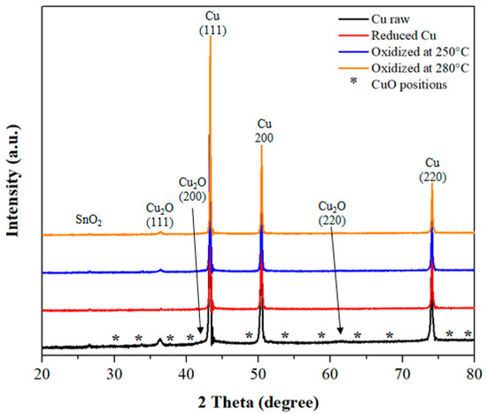 XRD analyses were performed to identify the crystalline phases present in the raw, reduced and oxidized Cu powders. The measured XRD patterns are presented in Figure 1. For the raw powder, copper (PDF 00-004-0836) and Cu2O (PDF 04-007-9767) oxide phases have been identified. According to the literature, the presence of a native oxide layer on the surface of copper particles is reported by several authors [64,65,66]. In contrast, no CuO oxide has been detected by XRD. However, XPS analysis confirms the presence of CuO at the extreme surface of the particles. This suggests that the copper particles of the raw powder are partially oxidized and thus have a native oxide layer on their surfaces, due to their exposure to air. Moreover, a low Tin dioxide (SnO2) content is revealed by XRD (PDF 04-003-0649) and confirmed by EDXS compositional analysis. Tin is known as a classic copper impurity.