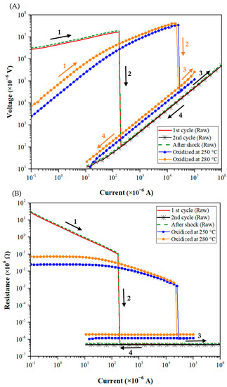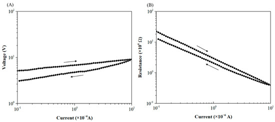 As the electric current is increased further up to 10−5 A (Imax), the voltage increases in a non-perfectly linear way up to 10 V (Figure 3A). Decreasing then the current from Imax to 10−7 A, one can notice that the U-I characteristic is not fully reversible and is marked by a short hysteresis. During this electrical cycle at low imposed current, a loss of resistance is observed, i.e., a reduction of 37% of the initial resistance (Figure 3B).