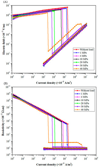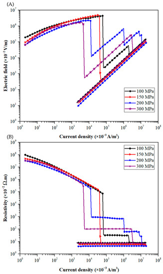 For the high load tests (i.e., stresses ranged from 100 to 300 MPa), the raw powder is poured in a stainless-steel die of 8 mm diameter, with an initial sample thickness of 1.0 mm. Figure 8A presents the measured curves of electric field vs. current density for various applied pressures. As noticed at low loads, the higher the applied pressure, the faster the electrical transition. The breakdown field falls to approximately 17.6 ± 3.5 kV/m under 300 MPa.