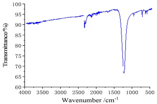 The sample was tested in infrared by a Fourier infrared spectrometer, and the wave number tested ranged from 4000 to 500 cm−1. The test results are shown in Figure 7. The functional group region is 3700~1333, while the fingerprint region is 1333~650, and the infrared spectrograms of the sample include two strong absorption peaks of CO2 in the atmosphere. They are near 2349 cm−1 and 667 cm−1, and meet the infrared spectral characteristics of the acetylene bond (-C≡C-) in the silver acetylene. For samples, the absorption peak appears at 1385 cm−1 or 840 cm−1, and they correspond to the antisymmetric stretching and vibration peaks of silver nitrate in the silver acetylene–silver nitrate.
