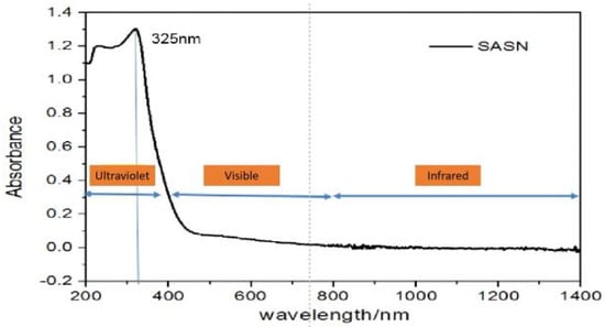 The SASN full-band absorption spectrum curve is shown in Figure 8. It is seen that it has a good absorption of ultraviolet light, with a wavelength ranging from 190 nm to 300 nm, and the SASN absorption reduces quickly between 300~450 nm, while the SASN absorption is not obvious if the wavelength is greater than 450 nm.