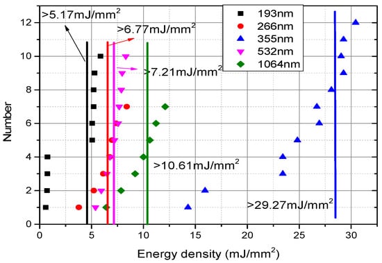 Table 4 shows the experimental parameters of initiation of different lasers, while Figure 10 shows the experimental thresholds of laser initiation SASN.